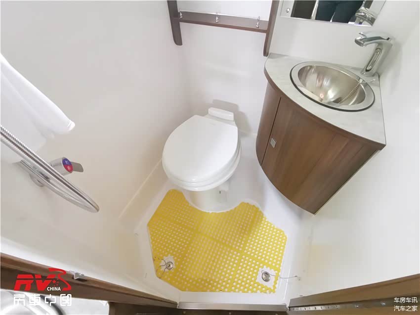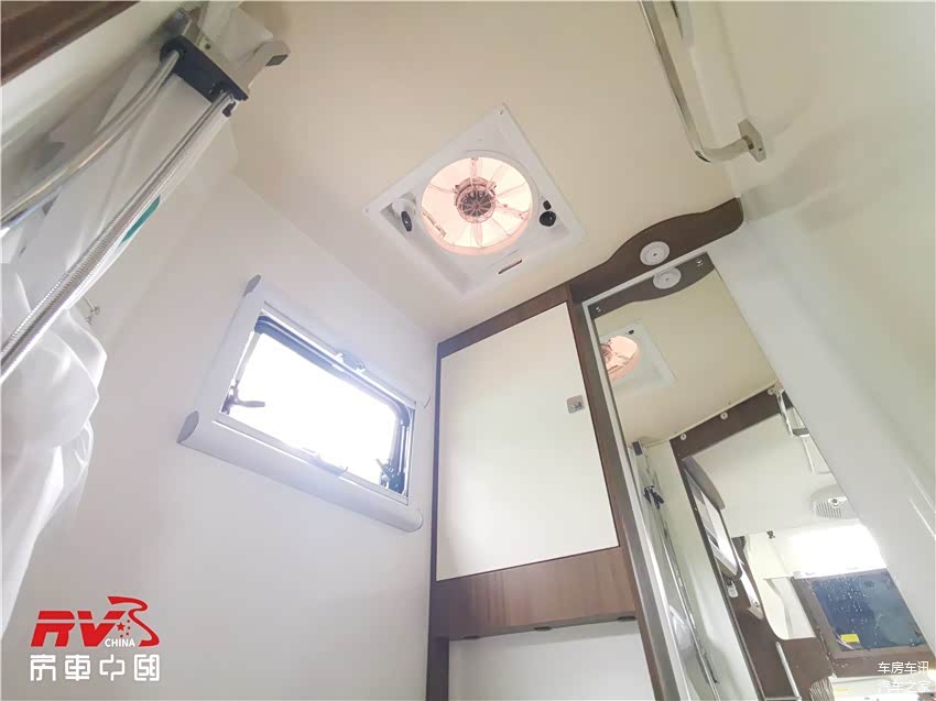 最后是车内的卫浴区,虽然空间不大,但是设施齐全,例如独立的花洒、洗手池、马桶、换气扇、通风窗、毛巾架、化妆镜、储物格等齐全。