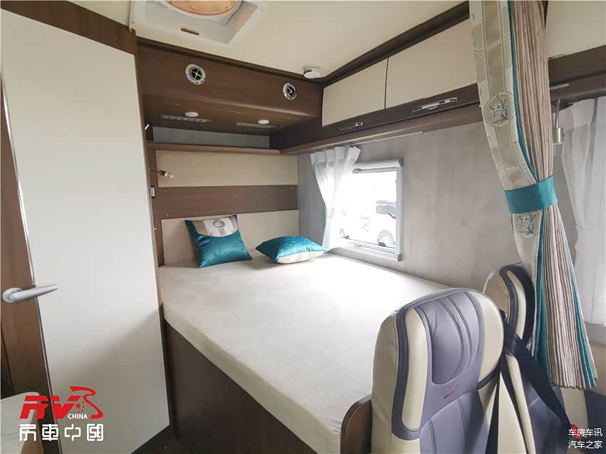 座椅的后面是纵置双人床设计的卧室,上方配有L型布艺帘,床的左侧同样配有大尺寸房车窗,为卧室提供很好的通风性和采光效果;上方的多组吊柜方便日常储物使用,增加车内的储物空间。