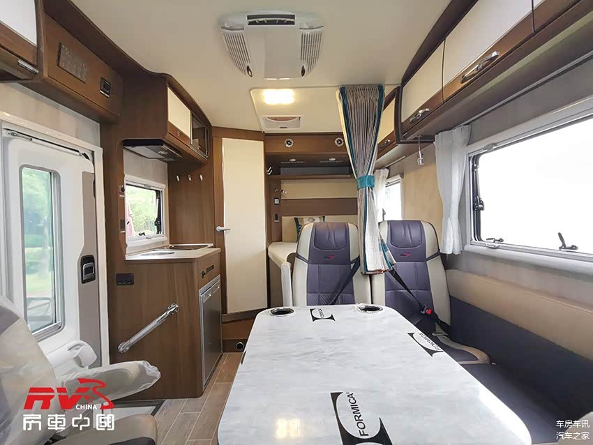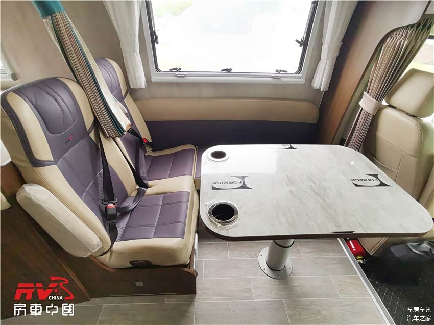 驾驶室的后方是乘坐的客厅区域,经典的L型座椅设计,中间配置的的可以前后、左右移动的升降桌板,在客桌的旁边还包含一张独立的汽车座椅;L型沙发的上方是大尺寸房车外推窗和多组吊柜,方便日常使用。