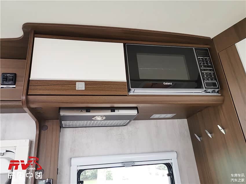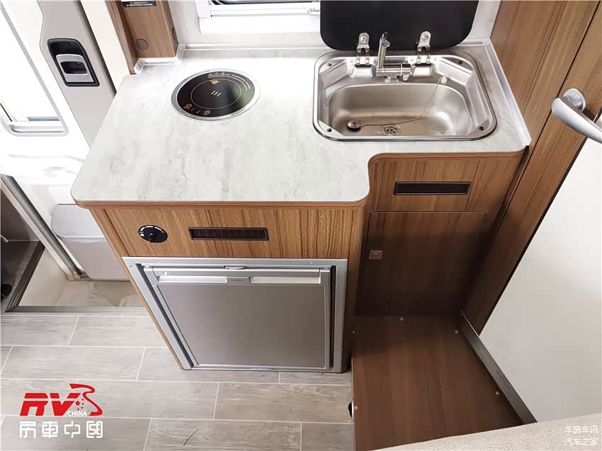 在车辆的右侧则是车内的厨房和卫生间区域。除了户外灶具,这款瑞弗V800房车车内厨房区域配备了微波炉、电磁炉、带翻盖洗菜池、抽烟机、220V插座、橱柜等,虽然配置的80L车载冰箱让人觉得很小,但是也可以满足日常的使用需求;侧壁上还贴心配置了几个小挂钩,方便放置厨房用品等。