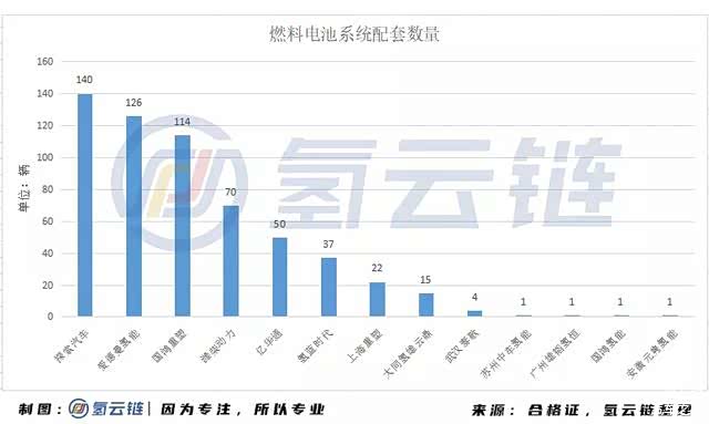 在燃料电池配套数量方面,探索汽车以配套140辆氢燃料电池汽车排名第一,爱德曼、国鸿重塑分别配套126、114辆分居二、三位;也是13家燃料电池系统配套企业中配套车型数量破百的企业;其次,潍柴动力以配套70辆排名第四;亿华通以配套50辆排名第五;氢蓝时代以配套37辆排名第六;上海重塑以配套22辆排名第七,大同氢雄云鼎以配套15辆排名第八;武汉泰歌以配套4辆排名第九;苏州中车氢能、雄韬氢恒、国鸿氢能、元隽氢能均配套1辆并列排名第十;