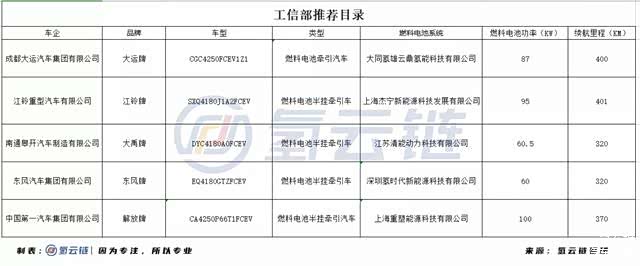 氢云链从工信部推荐目录了解到,目前工信部已经发布的《道路机动车辆生产企业及产品公告》中,共有5款燃料电池重卡车型上榜,分别为大运汽车、江铃重卡、南通皋开、东风汽车和中国一汽,分别由大同氢雄、上海杰宁新能源、江苏清能、深圳氢时代和上海重塑等燃料电池系统厂家配套。
