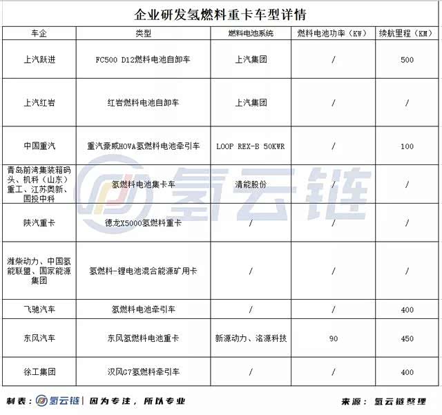 氢云链据公开信息统计到,目前国内车企成功开发燃料电池重卡车型的有上汽、陕汽、中国重汽、飞驰汽车、徐工集团等车企;而车型方面,拥有燃料电池牵引车、自卸车和矿用卡车等;