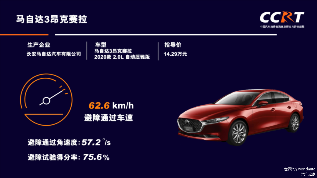马自达昂克赛拉避障操纵通过车速为62.6km/h。
