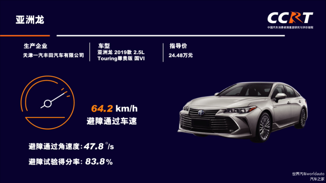 中大型轿车丰田亚洲龙避障操纵通过车速为64.2km/h。