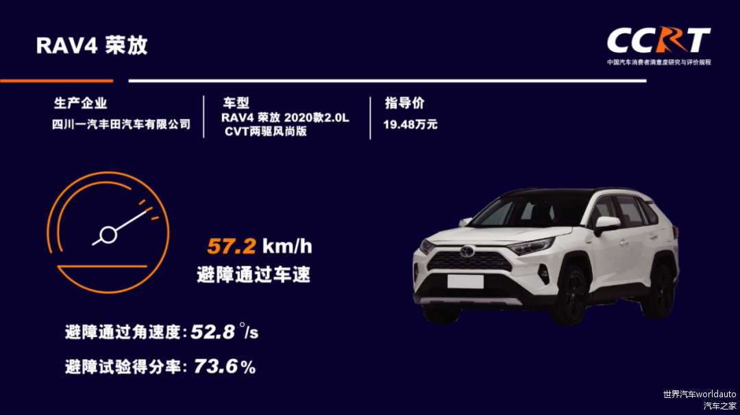 丰田RAV4荣放避障操纵通过车速为57.2 km/h。