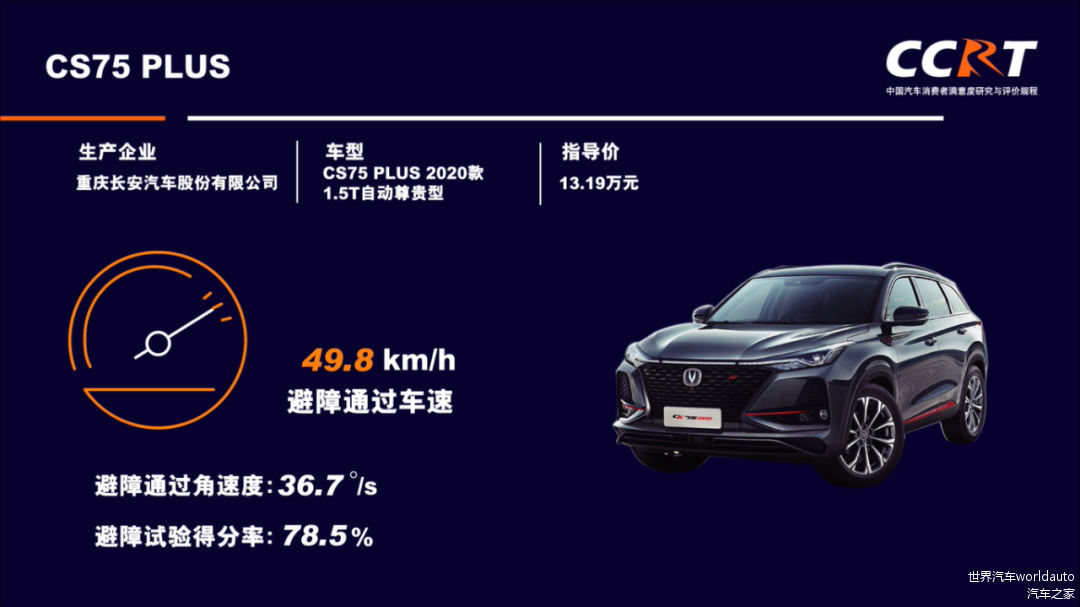 紧凑型SUV中,长安CS75 PLUS 避障操纵通过车速为49.8km/h。