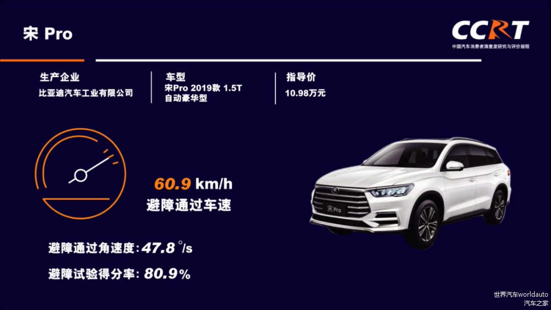 比亚迪宋Pro避障操纵通过车速为60.9 km/h。