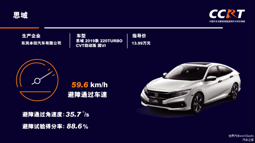 紧凑型轿车中,本田思域避障操纵通过车速为59.6km/h。