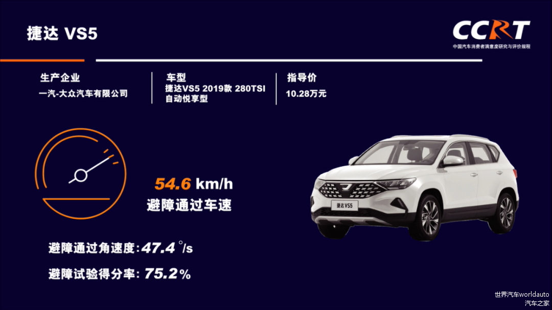 捷达VS5 避障操纵通过车速为54.6 km/h。