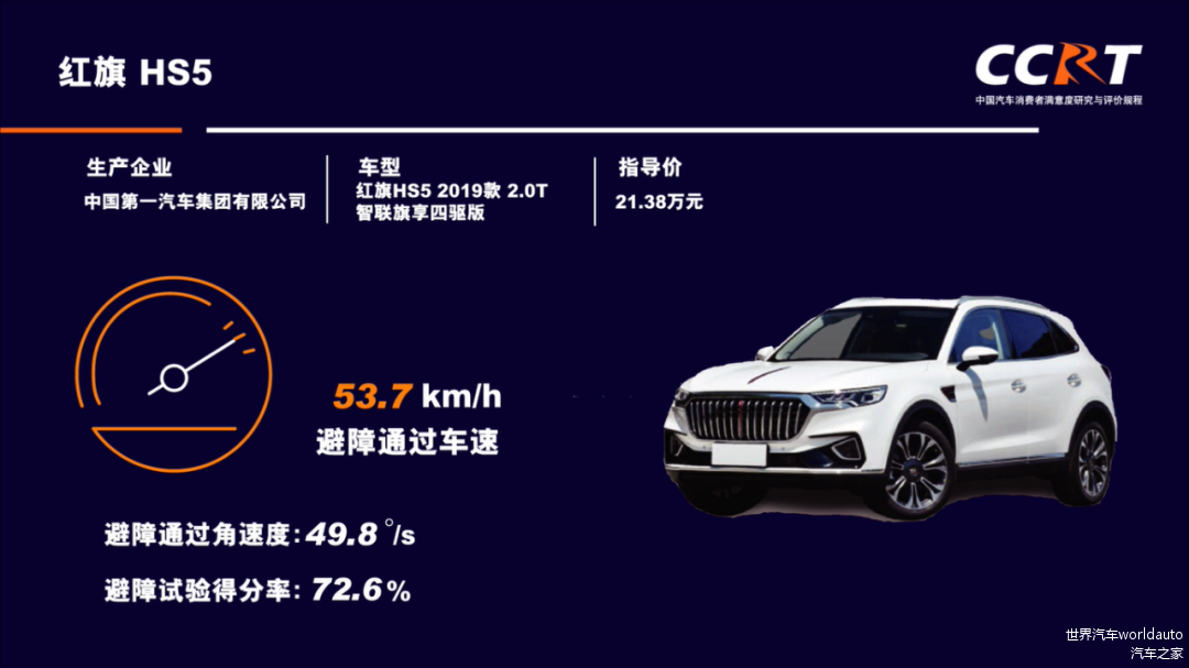 中大型SUV红旗HS5避障操纵通过车速为53.7km/h。