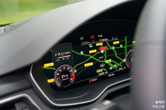 仪表盘内容显示清晰,当以导航为中心时,可将转速表和时速表调节至最小显示(也就是全局模式),不过,值得注意的是导航只能显示原车导航系统,不可投射第三方的高德地图。