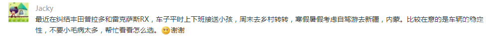 最近在纠结丰田普拉多和雷克萨斯RX,车子平时上下班接送小孩,周末去乡村转转,寒假暑假考虑自驾游去西藏,内蒙。比较在意的是车子的稳定性,不要小毛病太多,帮忙看看怎么选。