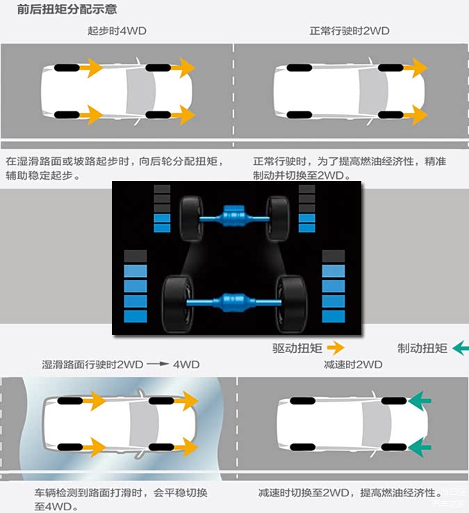作为最基本的四驱系统,这套系统主要以通过性、操控稳定性以及燃油经济型为主,在驾驶的过程中可以依靠车速、转向角和驾驶环境方面根据轮胎的打滑情况适当分配前后轮扭矩,在常规状态下的离合器处于断开状态,最大扭矩分配为100 : 0—50 : 50,并且它的两个后轮的驱动力采用了平均分布,也就是说左右后轮的驱动力相同。