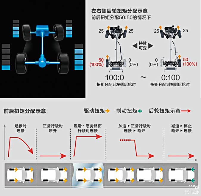 从名字可以看出,这款四驱系统与上面那款十分相似,而这套系统在工作模式上也与前者几乎相同,前后轮的最大扭矩分配依然为100 : 0—50 : 50,而两者最大的区别就是这套系统可以将这50%的动力单独分配给左右后轮之间的一个车轮上,也就是说左右后轮可以从100-0或0-100之间随意分配扭矩。还有一点不同之处就是这套系统配有自动断开机构,在不需要后轮时自动切换至两驱模式。