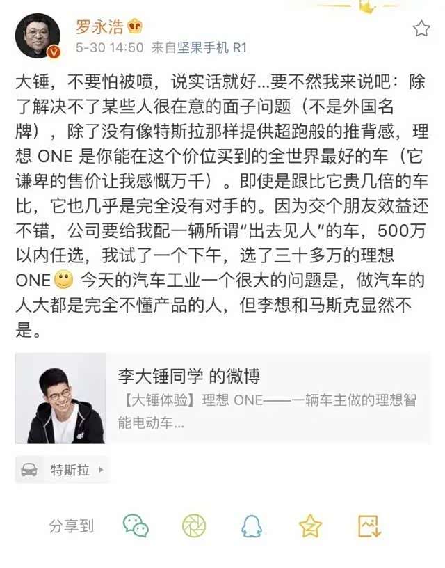 当然,相较于诸多造车新势力,时下的理想汽车其实已经走得够远了,不仅成功的在纳斯达克上市,首日便大涨43.13%。同时,它旗下的 理想ONE(图片 | 参数 | 询价)在当下还受到了广大老百姓的推崇,以及诸多业界大佬、科技人士的喜爱。诸如前段时间,前锤子科技CEO罗永浩先生,便将理想ONE带上了微博热搜。前因还是知名博主李大锤针对理想ONE的测评,招致了许多黑粉的攻击。