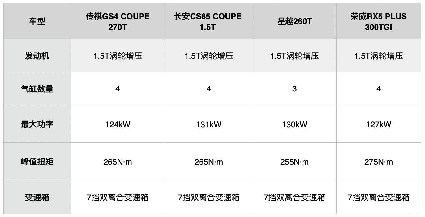 从参数上对比来看,四款车型1.5T发动机的功率、扭矩表现都在伯仲之间,只是需要注意的是,传祺GS4 COUPE、荣威RX5 PLUS和长安CS85 COUPE的1.5T发动机为为四缸发动机,而星越为三缸发动机,这对于一部分心态较保守的消费者而言,三缸结构的物理特性会让他们在心理上出现一定犹豫,但星越的部分车款配备了48V轻混系统,在一定程度上弥补了三缸引擎的先天不足。