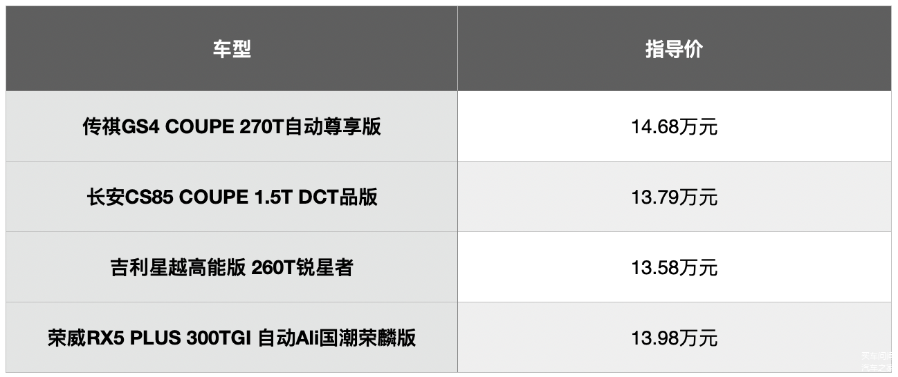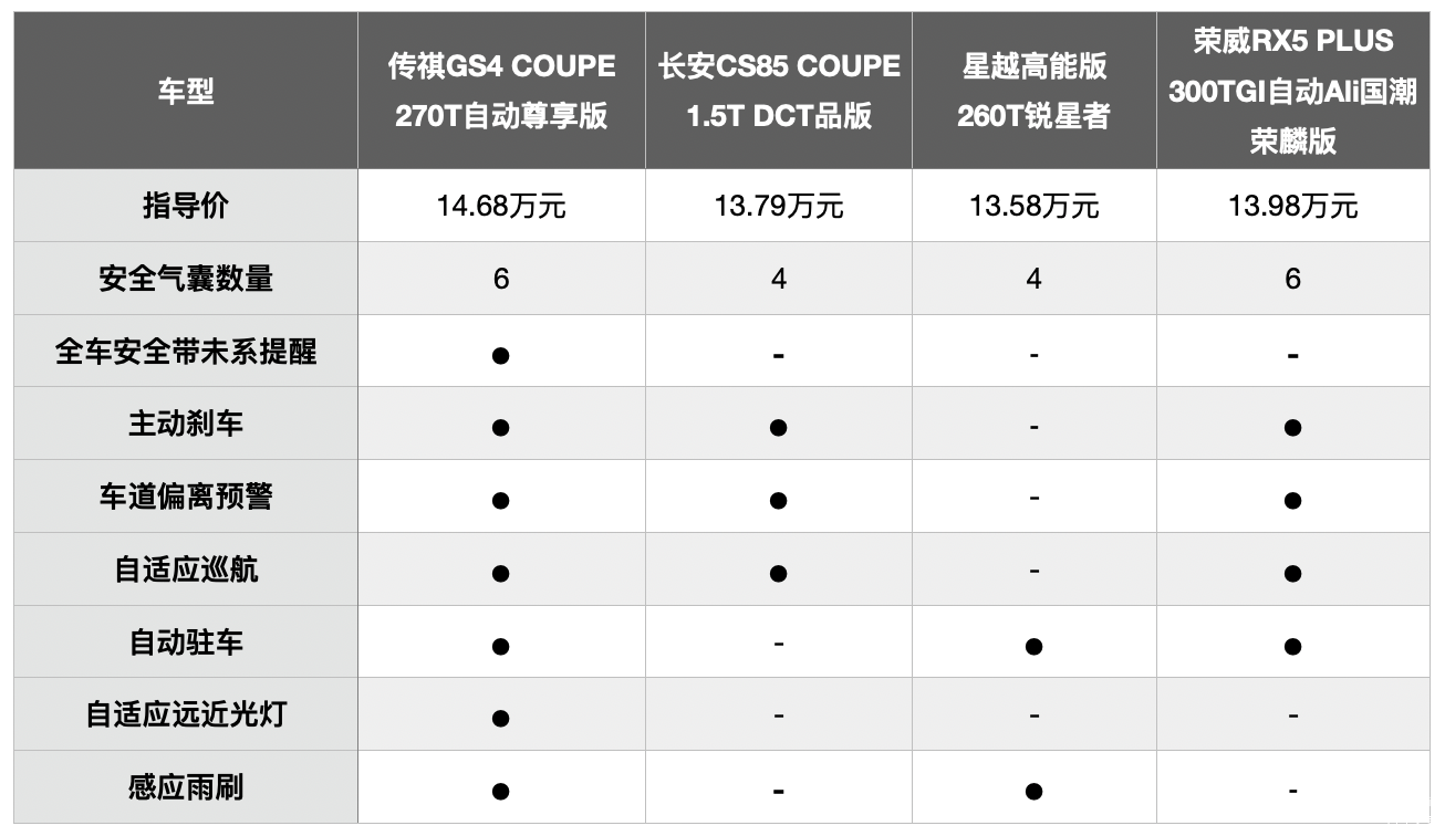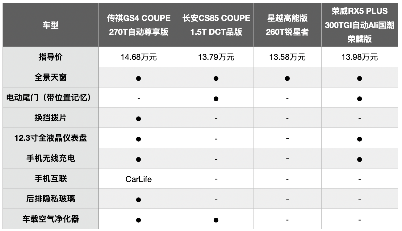 逐一明确基本产品的素质之后,在15万元内价位我们截取了传祺GS4 COUPE 270T自动尊享版、长安CS85 COUPE 1.5TDCT品版、星越高能版260T锐星者、荣威RX5 PLUS 300TGI自动Ali国潮荣麟版进行配置对比。