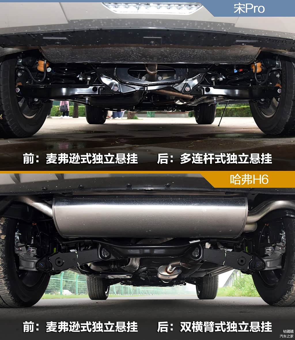 底盘结构方面,两款车均采用四轮独立悬挂,宋Pro为前麦弗逊式、后多连杆式,哈弗H6为前麦弗逊式、后双横臂式。调校风格则毫无意外地向舒适性倾斜,符合家用定位。SUV的悬挂长行程优势,在面对大坑洼时,能更好地缓冲来自路面的冲击,减振舒适性比起同价位轿车更具优势。