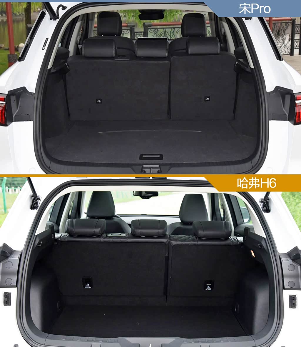 储物空间方面,两款车都有不错的表现。宋Pro的行李厢标准容积达到了520L,后排座椅支持4/6比例放倒,放倒后可形成全平空间,最大容积为1340L。官方并未公布哈弗H6的行李厢容积,不过该车同样配有后座比例放倒功能,空间灵活性还是不错的。