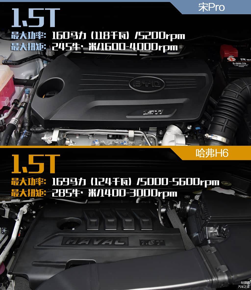 哈弗H6同样搭载一台1.5T发动机,最大功率为169马力(124千瓦)/5000-5600rpm,峰值扭矩为285牛·米/1400-3000rpm,与之匹配的是7挡双离合变速箱。从账面参数看,哈弗H6小有优势,不过它的整备质量更重,所以实际动力性能与宋Pro在伯仲之间。