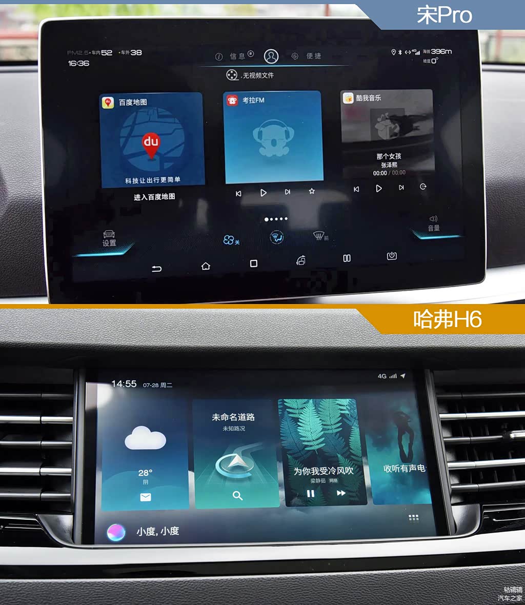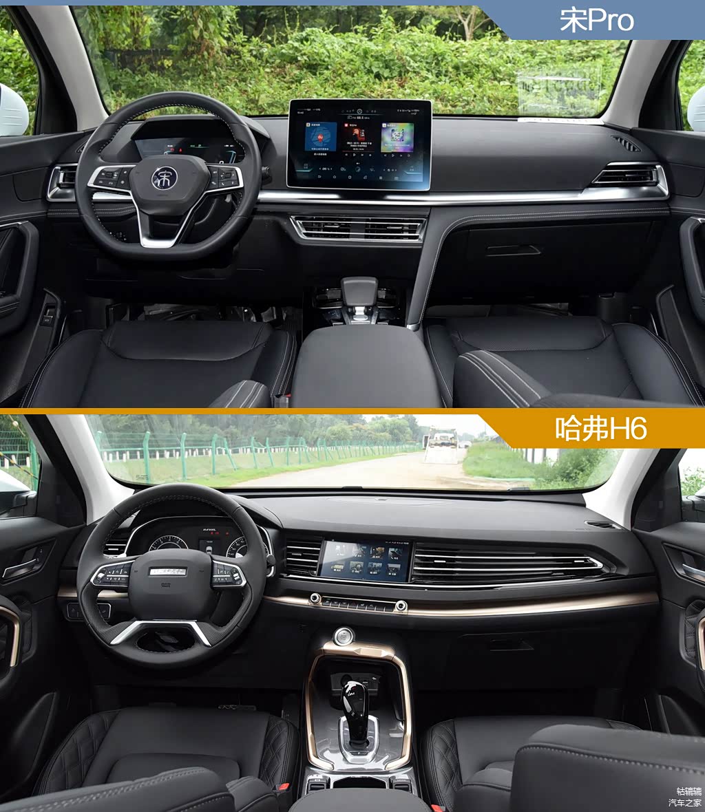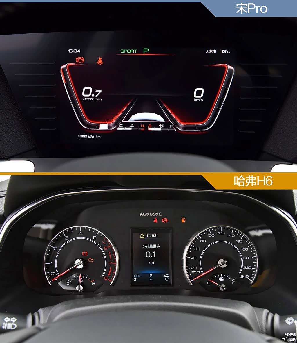 相比于宋Pro,哈弗H6的车机功能相对不那么丰富,主要体现在生态资源和OTA升级方面。此外,哈弗H6的中控屏位置偏低,操作起来不是非常方便。参加对比的冠军版车型采用机械式仪表+3.5英寸行车电脑的设计,全液晶仪表只提供给豪华版以上车型。