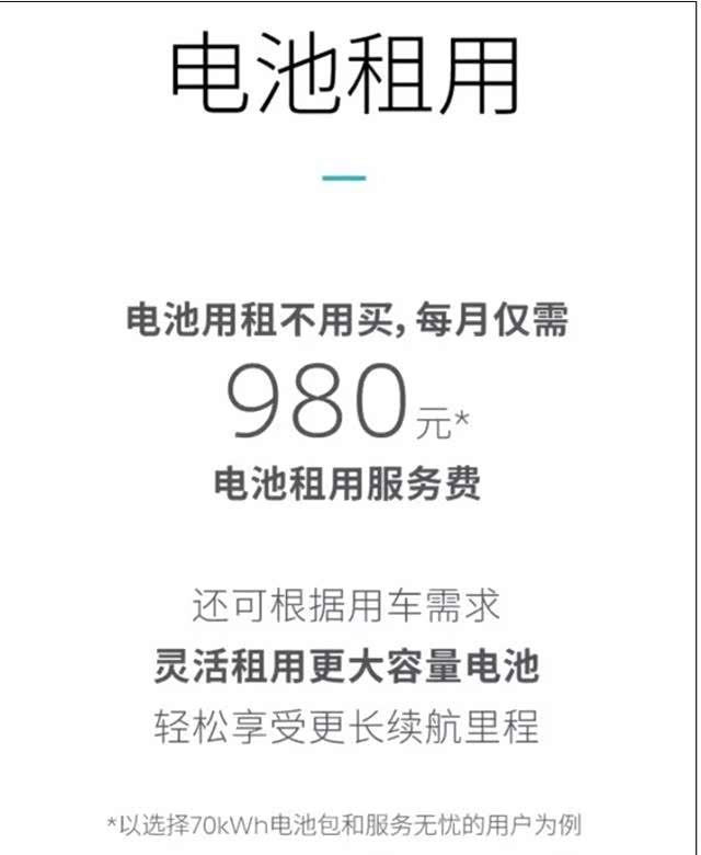 对于占据电动车40%成本的动力电池来说,这种模式可以大大的降低首次购车成本,以整车售价为46.80元的蔚来ES8为例,补贴后售价为45万元,而选车电分离模式的购车价仅38万元,节省了7万元,大大降低了购车门槛。而车主每月仅需支付一定的电池租用服务费,同时还可根据用车需求灵活租用更大容量的电池。