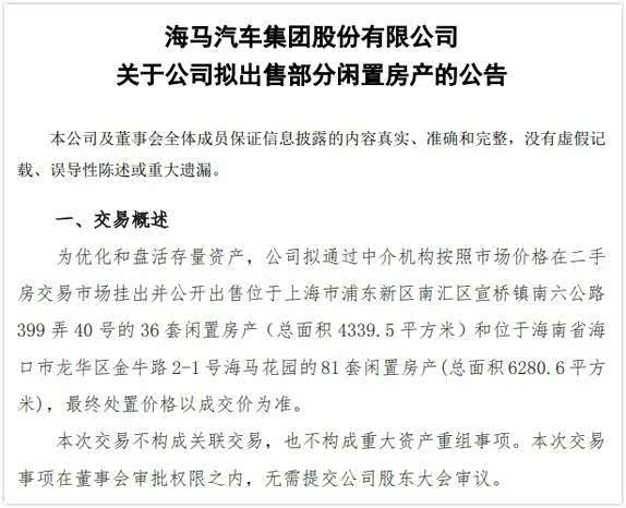 从2017年开始,海马汽车便开始处于下滑状态,由于2017年2018年连续亏损,海马汽车被深圳证券交易所实施了退市风险警示,股票简称变更为“*ST海马”。到2019年,海马汽车累计销量仅为2.95万辆,同比下滑达56.41%,扣除非经常性损益之后则亏损7.3亿元,无奈之下海马汽车只能多次卖房求生。
