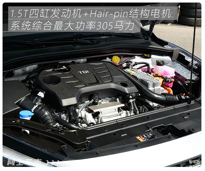 首先我们先来介绍一下新车的动力总成,和19款车型相同,第三代MG6 PHEV依旧采用了1.5T四缸发动机+Hair-pin结构电机,这套系统的综合最大功率达到305马力,峰值扭矩为480Nm,而传动系统方面采用的是第二代10速EDU变速箱(发动机6挡、电机4挡)。