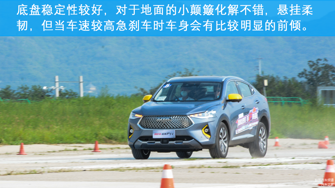 经过全新的调教的底盘,在舒适性与运动性的均衡方面有所提高,相比于20款哈弗F7x在滤震方面有明显提升,震感更加柔和,对小颠簸的化解较好,但路感略显清晰。高速转向时车身具有较好的稳定性,侧倾不明显,相比20款F7x表现更加优秀。NVH方面这款车还存在着一些不足,当车速较快时,噪声明显增加,车内交流需提升音量。
