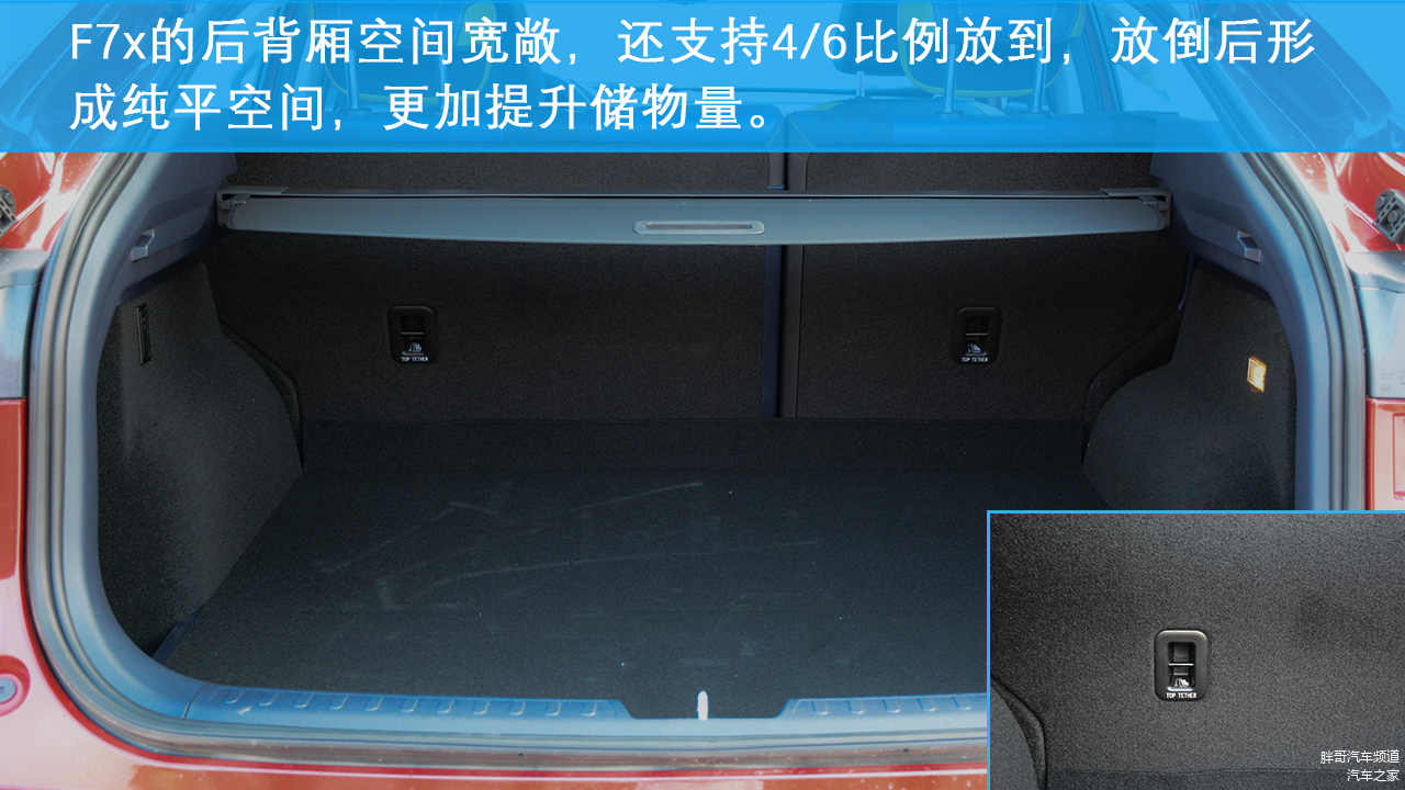 储物空间方面,哈弗F7x整体做的不错,在前后车门、中控台下方、挡杆后方和后排座椅中间扶手位置都设有储物格。不过中控台下方的储物位置略低并且十分隐蔽,对驾驶者的使用应该起不到很大作用,但是在当中设置的USB充电口还是较为实用的。这台车的乘坐空间不错,整体来说只有后排的头部空间由于满足了其溜背的造型而受到了影响。后背厢空间宽敞,虽然高度有所牺牲,但进深较大,依旧可以放下大件物品。