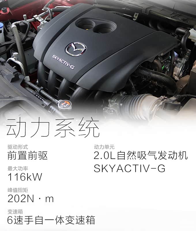 目前市场上比比皆是小排量涡轮增压发动机,而马自达一直坚守在自然吸气技术路线上,这款升级版2.0L SKYACTIV-G发动机的优势在于,动力随踩随有线性输出,同时油耗方面也有着很不错的表现。特别是在城市中低速路况下,配合6速手自一体变速箱,能做到真正的车随心动。
