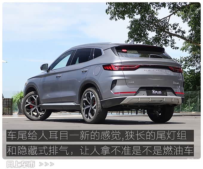 宋PLUS前脸部分采用比亚迪“龙脸”3.0设计元素,轮廓和宋Pro保持一致,只不过前格栅从宋Pro上的横条幅样式转变为更为精致的点阵式。而在车身侧面和尾部,则完全是全新的设计,特别是车尾造型,层次感非常鲜明,狭长的全LED尾灯组、横贯式示宽灯带以及和尾翼浑然一体的高位刹车灯,再加上隐藏式双边排气,让人一时间产生“这是一款新能源车型”的错觉。