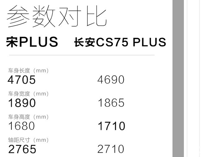 在车身尺寸的设定上,宋PLUS的身材介于宋Pro和唐之间,和它的产品定位相匹配。和市场上的主流竞品车型长安CS75 PLUS相比较,宋PLUS在轴距和车身长度方面有一定优势,内部空间更为宽裕一些。