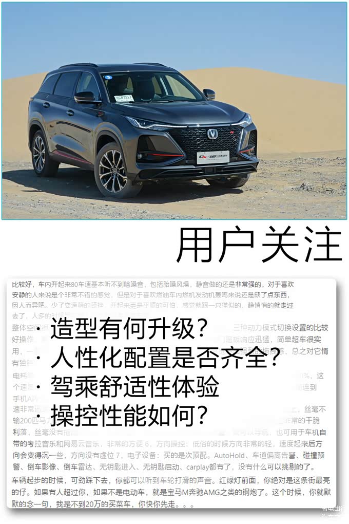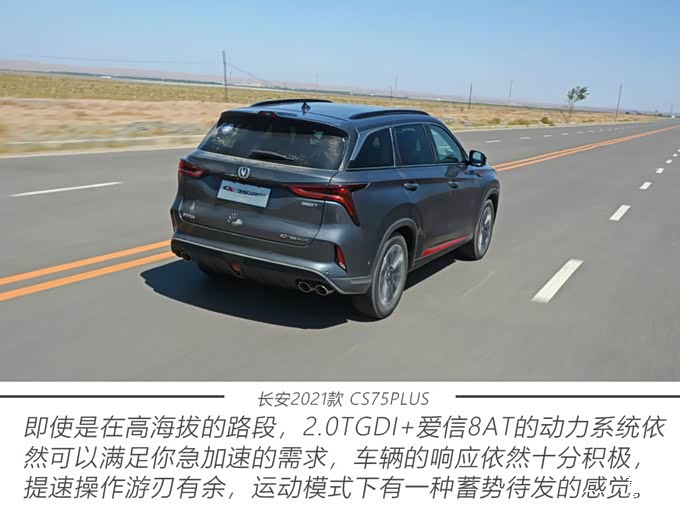 当然,要创造辉煌的佳绩,除了能力过硬,也要懂得居安思危,审时度势,为此,长安汽车即将为普罗大众带来2021款CS75PLUS。作为一款中期改款车型,新车在整体造型方面的变化并不大,仅仅是针对部分细节进行了调整,至于在座舱方面的升级,则是此次改款的重点。此外,为了感受2.0TGDI+爱信8AT动力系统出众的性能表现,我们还特意在海拔较高的路段和沙漠路况,对新车进行了深度体验。接下来,看看2021款CS75PLUS是否诚意十足?