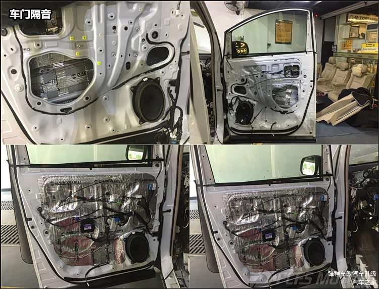 清洁工序后技术师傅以必拓环保止震板进行车门内层外层隔音贴装,内层以十字方式贴装压紧、外层则以铺满的方式进行密封处理,使整个门腔形成音箱,为喇叭打造一个良好的发声环境。