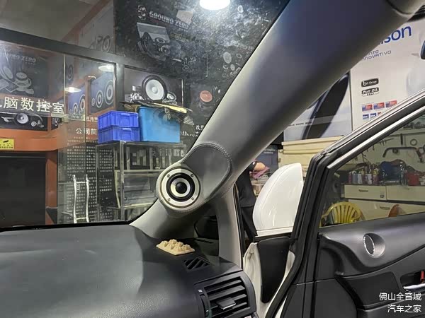 日本必伟精确系列黑色偏心轴高音单元采用倒模的方式固定在A柱上,缝制工艺显得非常高端大气。。