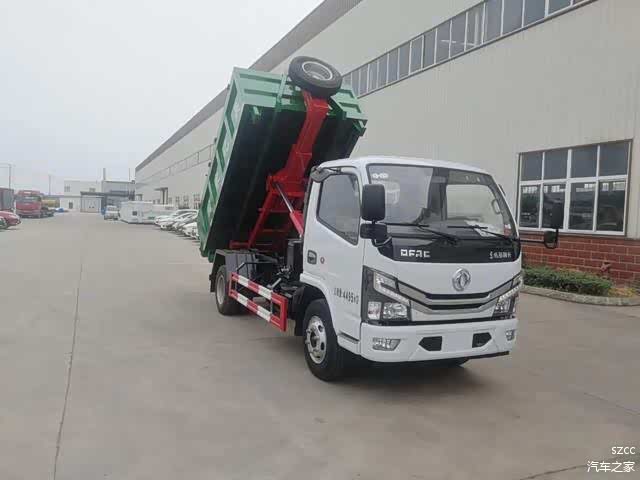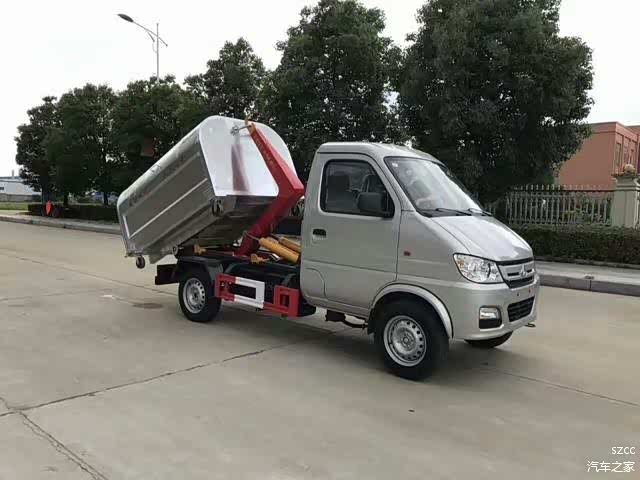 该车的箱体部分完全由液压系统来控制,在平日里可将车载垃圾箱放置到各个垃圾收集站,待垃圾收集满后,该车可直接开赴至垃圾站,通过液压系统的操控,可将垃圾车后座上加装的勾臂放下,挂住站内垃圾箱前端的连接点,将垃圾箱拉至车体的后座上,此时即可启动车辆,将垃圾运送至垃圾处理站内,进行自卸式倾倒。