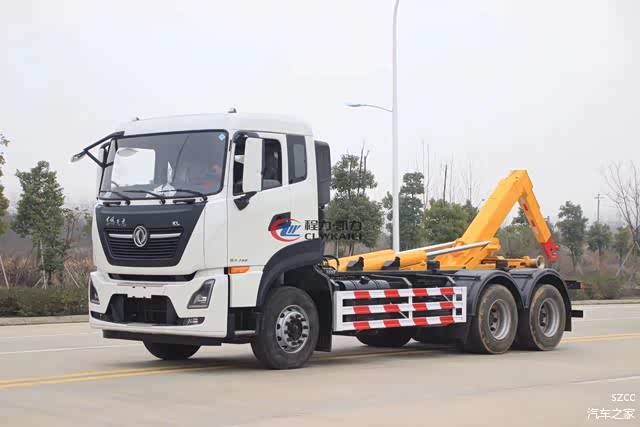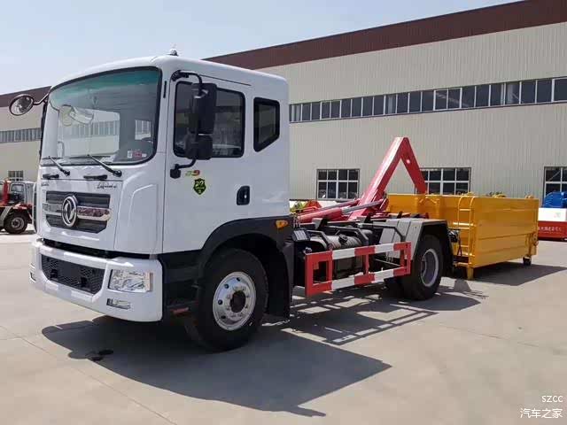 勾臂式垃圾车可将地下垃圾箱内的垃圾及垃圾箱一同拉至车上运走同时可自卸,且垃圾箱体采用液压锁紧或开启,将 低了工人的劳动强度和改善了工作环境。该垃圾车的收运方式是目前世界上广泛采用的垃圾收运方式,可以实现一车多箱,大大降低了配备成本和空间等等;其专用装置的功能均以汽车发动机为动力,通过液压机构手动或电控、气控来实现。