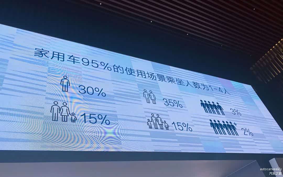 结果发现,日常用车车内人数在1~6+人的比例,分别是30%、35%、15%、15%、3%和2%,也就是说,95%的家用车使用场景,乘坐人数都在四人及以下。