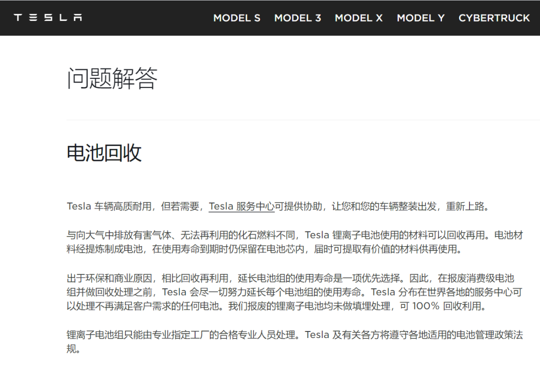 特斯拉官网表示,报废的锂离子电池均不会做填埋处理,可100%回收利用。