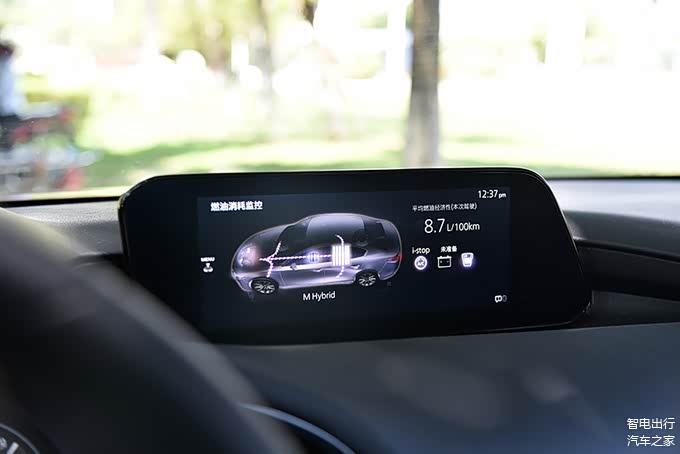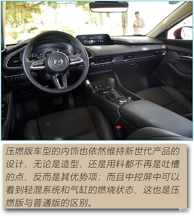 马自达新世代产品在内饰上的提升有目共睹,无论设计,还是用料都不再是吐槽的点,反而是其优势项。压燃版车型的内饰也依然维持的这种设计,咋看没什么区别,但是在中控屏内多出了一项能量传输,以及SPCCI火花点火控制压燃点火技术的图,可以直观看到轻混系统工作的状态和气缸燃烧状态,这也是这款车与普通版的区别之处。