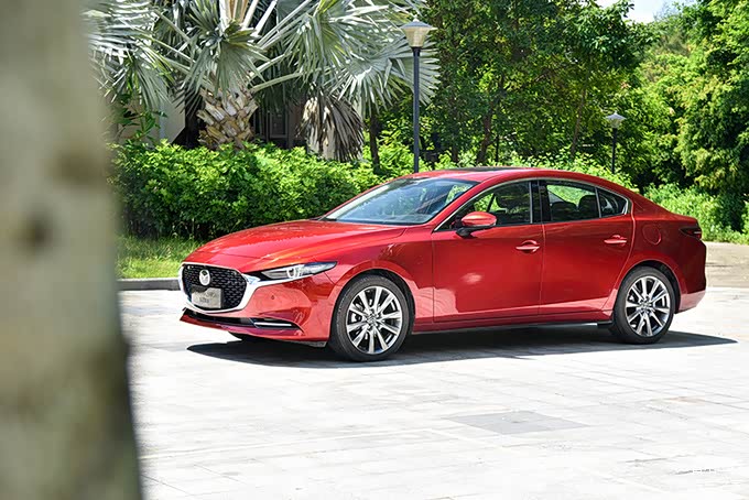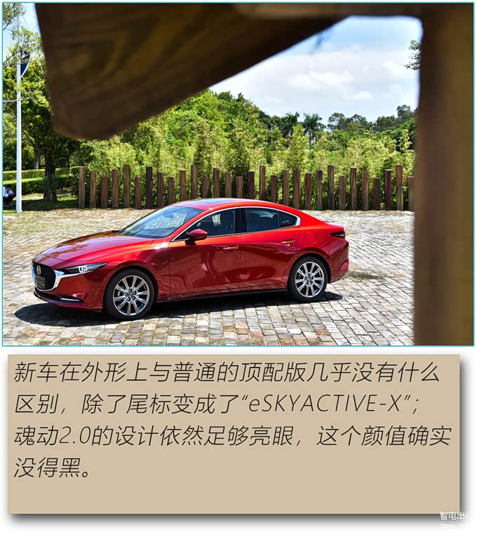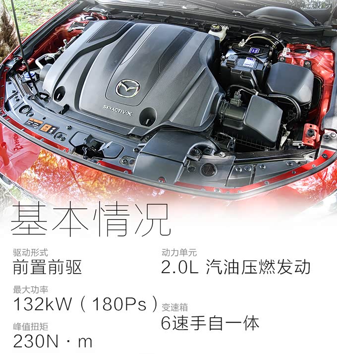 在回答第一个问题之前,有必要介绍一下X车型与普通版的区别。毫不意外,抛开发动机,新车在外形上与普通的顶配版几乎没有什么区别,除了尾标变成了“eSKYACTIVE-X”。这种工科男的做法很符合马自达,并不需要什么额外的噱头来为这款新车造势,打开发动机盖,几乎占满机舱的全新发动机就足以让粉丝们激动,更何况魂动2.0的设计语言已经让这款车的颜值在同级中十分突出。