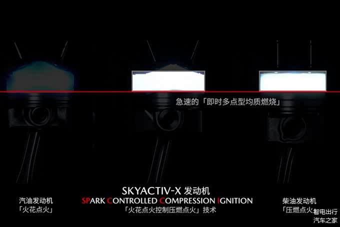 事实上,得益于马自达独创的SPCCI火花点火控制压燃点火技术,使得这款发动机气缸内的燃烧方式与普通汽油机有本质的不同。普通发动机在火花点火的情况下,先从火花塞周边开始燃烧,然后慢慢扩散到整个燃烧室;而马自达采用压燃点火是混合气体自燃点火,使燃烧室整体在短时间内爆发性燃烧,对活塞的推动作用时间长,推动力更大,可节省燃料,实现动力强劲的行驶。