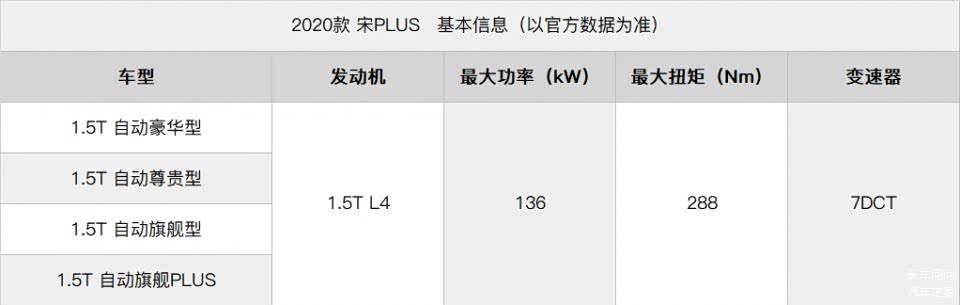 动力部分宋PLUS全系都搭载同一台1.5T四缸涡轮增压发动机,最大功率136kW,最大扭矩288Nm,从数据上看这台发动机的表现可谓相当亮眼,已经接近目前主流2.0T低功率发动机的水平。传动部分与之相匹配的则是一台目前同级车型中比较主流的7速湿式双离合变速器,值得一提的是比亚迪这台变速器针对中国用户使用习惯和使用场景进行了针对性优化,平顺性、经济性以及可靠性都表现上佳。