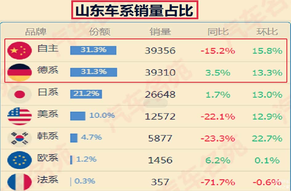 另外,德系车也深受山东人喜爱,比如宝马汽车、奥迪汽车、大众汽车和斯柯达汽车等,比较常见的车型有大众朗逸、大众桑塔纳、大众途观L、奥迪A4L、宝马3系和斯柯达明锐等。而其它北方省份也是大致如此,比如河南省份的自主车系占比为34%,北京市的德系车占比为35.1%,而河北省的自主品牌占比为36.8%等等。