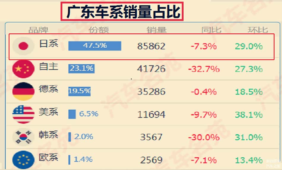 其次来看下南方代表,广东省是南方第一经济大省,它的汽车销量占比也是非常高,所以广东省也很有代表性。根据数据来看,广东省汽车销量占比最高的是日系车,其比例高达47.5%,几乎占到了一半,而国产车和德系车都在20%左右。