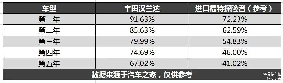 保值率比较汉兰达优于探险者。全新汉兰达上市后,将继续保持奇高无比的保值率,通过数据分析后,五年后二手车残值汉兰达还能保持在67%左右,也就是30万的车开5年后还能卖20万,远高于探险者。