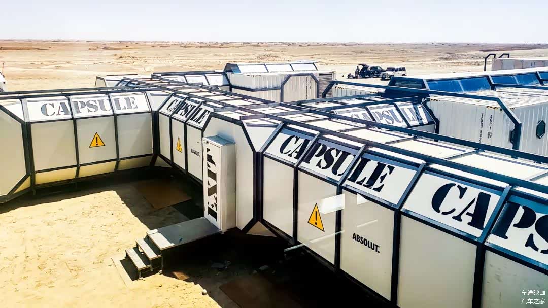 当我们还沉醉于窗外宁静的湖畔,车队再次拐向了一片无人区。与前一日红崖景观不同,这一路更多的盐碱成分,当地貌呈现了更多灰色与黄色,路面也变得更加颠簸。当我们看到了这座好似太空舱的房屋,这里就是传说中的“火星营地”,但总觉得如果把这片营地放在昨日的红崖景观里才更名副其实。