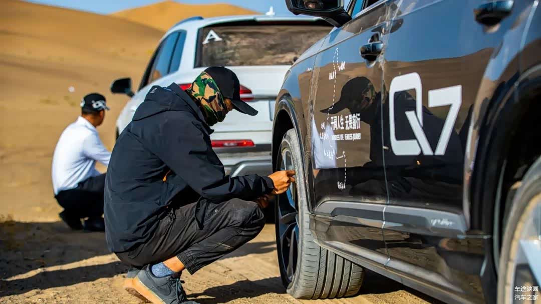 然而,我们所有的Q7连四季胎都不是,完全是公路胎。就算四驱系统再强大,面对细软的沙子依然无能为力。但教练告诉我们,直接轮胎放气,胎压从2.5bar直接放到0.6bar。我没有听错,伴随着胎压报警,轮胎用肉眼看已经瘪的不成样子。